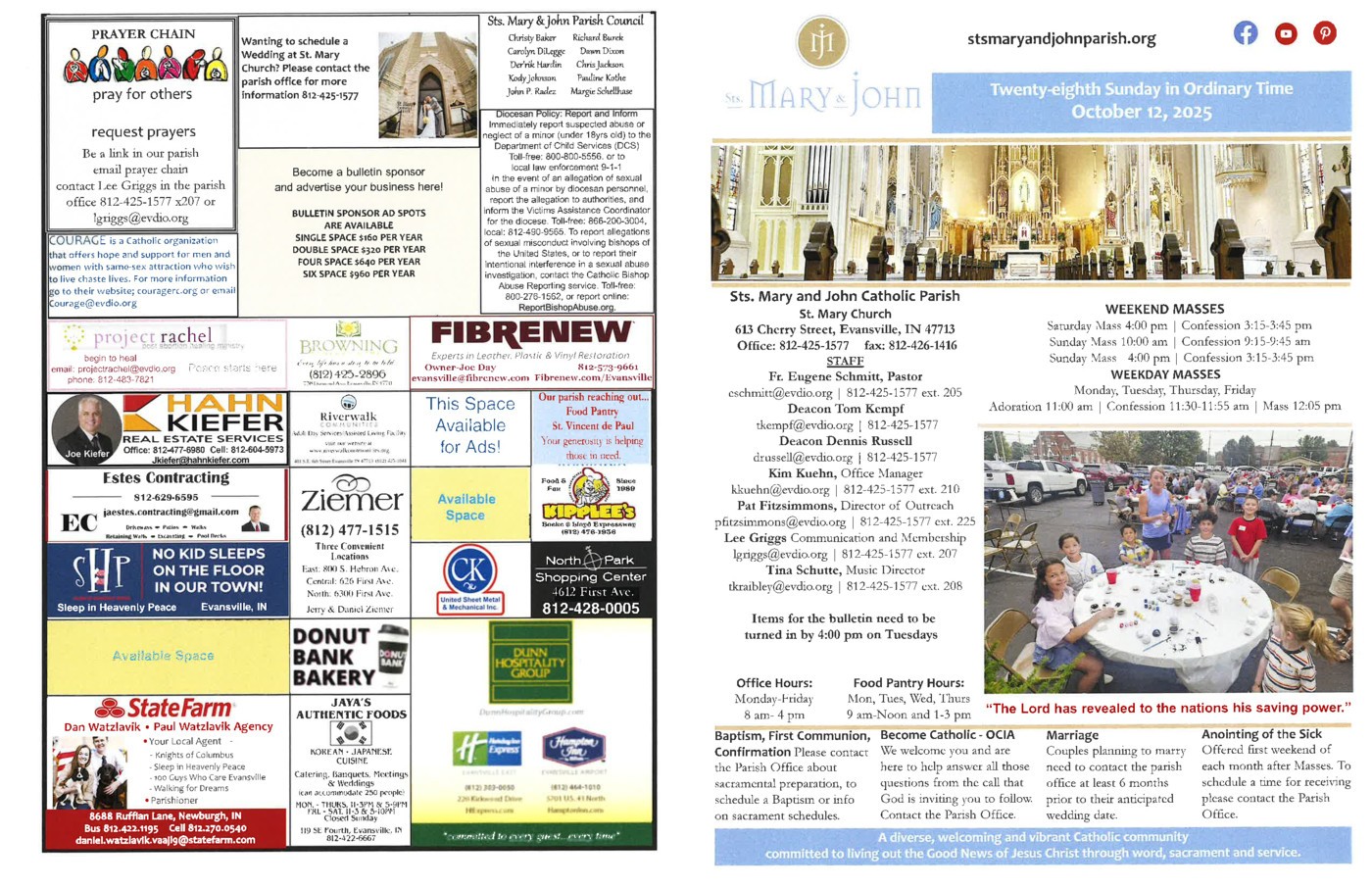 Good evening. This weekend we celebrate the 28th Weekend in Ordinary time where we hear in the first reading from Naaman who is cured of his leprosy. This Saturday, October 11 we will have our Fall Cleanup from 8 am to 11. All are welcome. This Monday there will be a Men's group meeting at 5:30 pm in Rager Hall. All men 18 years old and older are invited to come. CAJE will have a listening session on Saturday, October 18 at 2 pm in Rager Hall. This meeting is to provide direction in what will be the main goals and objectives for this ecumenical group as they work with civic officials in strengthening our city. Anyone is invited to attend. Coffee and doughnuts will take place after the 10 am Mass on Sunday, October 19. If you are contacted via text stating that they are me, Fr. Eugene, and in need of a favor or a gift card, please disregard this text. Please pray for Alan and Annie Groves along with their family. Alan passed away recently and his funeral will be this Monday at 10 am at Sts. Mary and John with viewing from 9:30 am to 10 am at the Church on Monday and viewing the day before at Pierre. Thank you for all you do for our parish. May God bless your weekend.