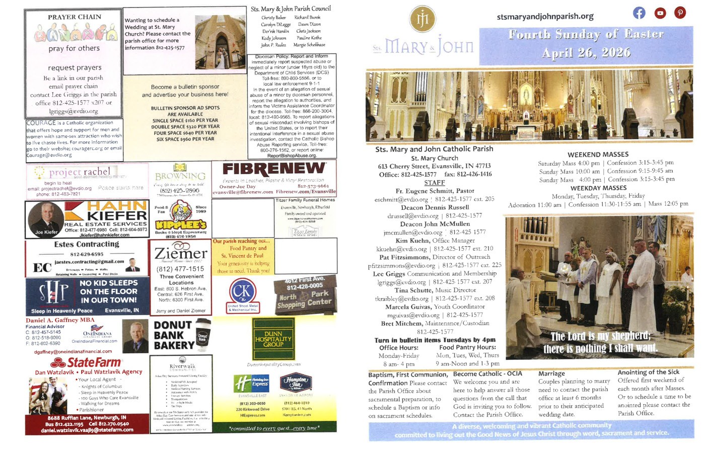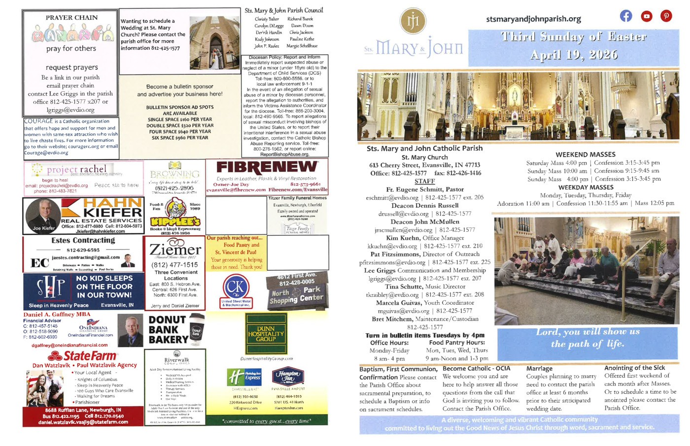 Good evening. This weekend we celebrate the Third Sunday of Easter and also Mass of Creation at all weekend Masses. As part of Creation Care Masses, as you enter Church you will be given a paper to ask what is your happy place in nature and what is a gift of creation for which you are especially grateful? You can leave them at boxes as you leave Church. Creation Care t-shirts will be sold after Mass in the hallway. After the 10 am Mass on Sunday we will have Coffee and Dougnuts along with a reception to welcome Deacon John McMullen and his wife Mary Grace to the parish. Please take a moment to welcome them. May 1 and 2 will have an alms second collection and anointing of the sick after Mass. Please pray for Chase Riecker and Nathan Folz who were ordained transitional deacons this weekend. Please pray for our kids who will be making their First Communion Retreat this weekend and as we plan implementing changes for Confirmation that the Diocese has requested. Finally we pray for those who are sick in our parish and for peace in our world. Thank you for all you do for our parish. May God bless your weekend.