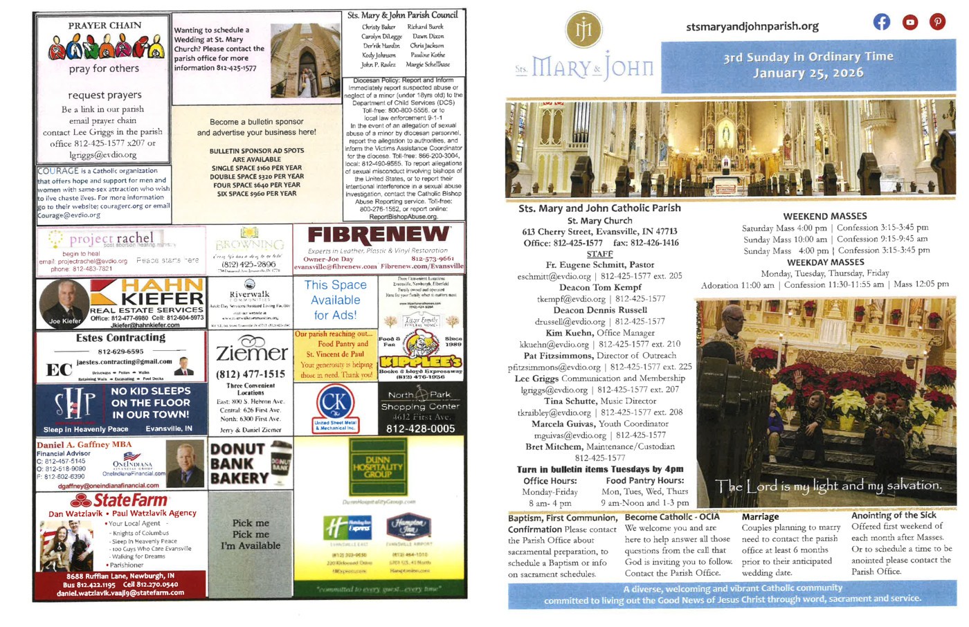 There will be NO 12:05 pm MASS on Monday or Tuesday, January 26 and 27, 2026.