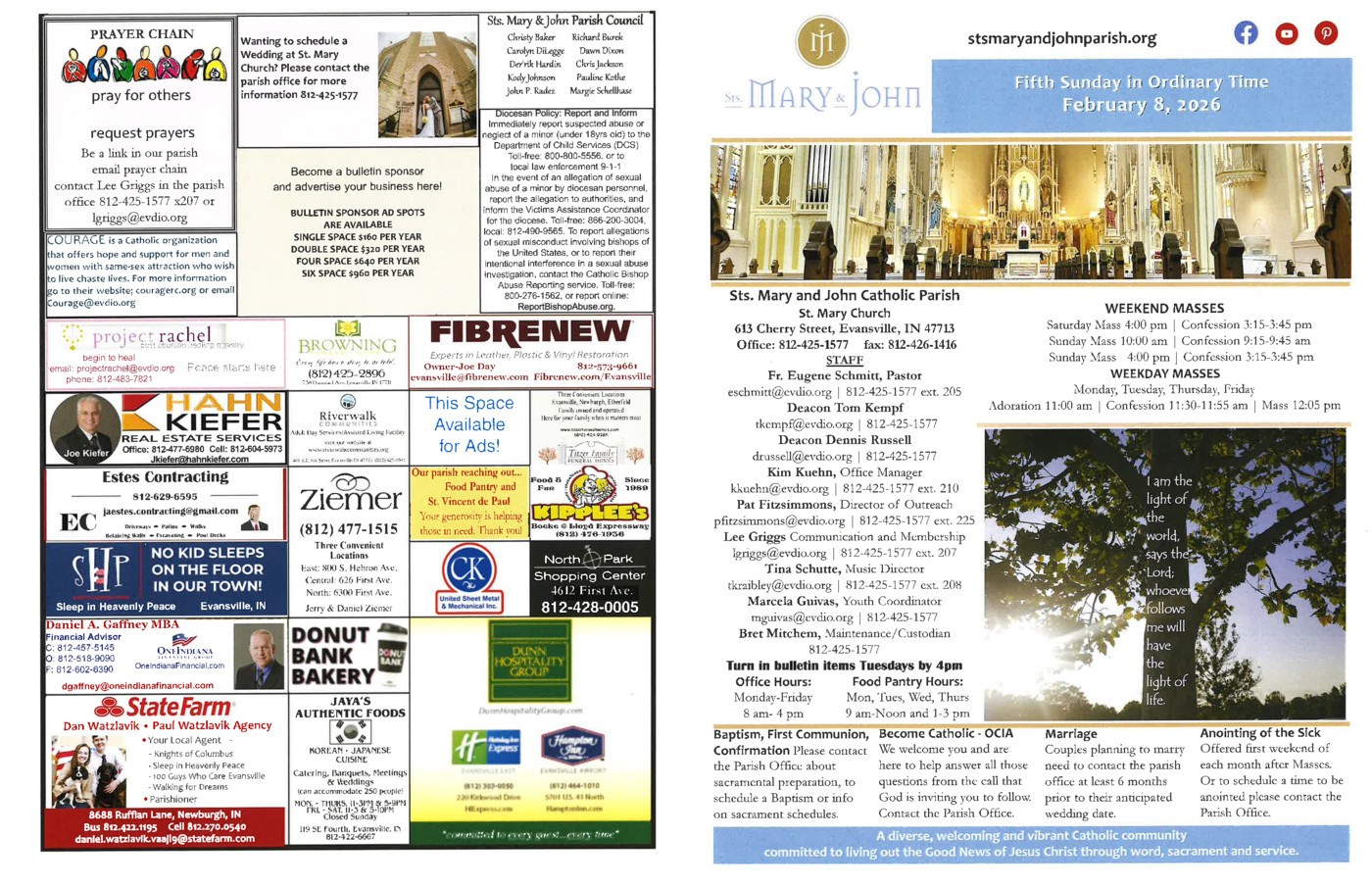 Good evening. This weekend we celebrate the fifth Sunday in Ordinary Time, where we are called to be light for the world. Are second collection for Alms is this weekend at all Masses and anointing of the sick will take place after Mass. Coffee and doughnuts is after the 10 am Mass this Sunday. There will be a new Women's bible study and spirituality group held on Saturday mornings starting February 28 at 10 am. Please come to hospitality after Mass this Sunday or email Laurie Ewers at [email protected] to provide some input and sign up. The Right to Life Diaper Drive continues until March 1. More details are in the bulletin. This coming Monday the Men's group will meet at 5:30 pm in Rager Hall. Mardi Gras Fat Tuesday will take place February 17 in Rager Hall from 6 to 8 pm bring a potluck dish with desserts provided. Ash Wednesday Mass schedule is February 18 at12:05 and 5:30 pm. Parish Lenten Mission with Jim Ware will be February 22, 23 and 24 with all nights starting at 6 pm. There will be food before the Sunday, February 22 presentation. This is great way to start your Lenten journey and get you in the right space for Lent. Please remember in your prayers Kathy Weinzapfel and her family. Kathy's funeral will be Saturday at 10 am at Sts. Mary and John. Please remember in your prayers all those taking part in the OCIA retreat this weekend. Their names are in the bulletin. Finally we celebrate World Day of Prayer this weekend as we pray for peace in our country and world. Thank you for all you do for our parish. May God bless your weekend.