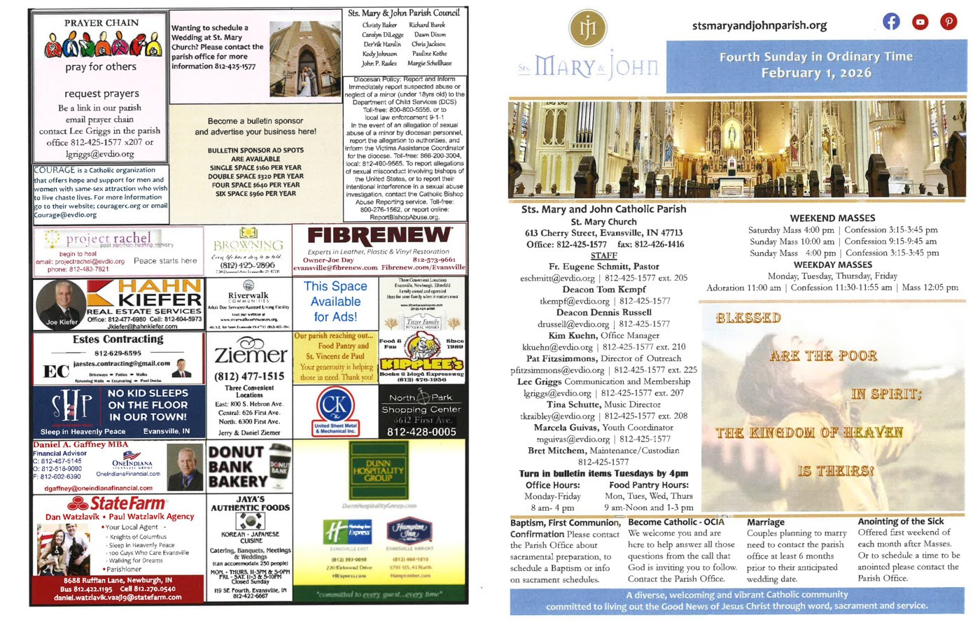 Good evening. This weekend we celebrate the 3rd Sunday in Ordinary time where Jesus calls us like He invited His apostles to follow Him. Parish cancelation information can be on the parish website, parish Facebook page or channel 14. The Souper Supper has been canceled for Saturday. January 31 and Feb 1 weekend Fr. Adrian Burke, a Benedictan Monk from St. Meinrad will be here for Saint Meinrad weekend at all weekend Masses. We will bless throats that weekend and Tuesday, February 3 at the noon Mass. A diaper drive will start February 1 and last for the whole month. More details in the bulletin and on our website. February 7 and 8 we will have our alms second collection and anointing of the sick after Mass. Men's group will take place Monday, February 9 at 5:30 pm in Rager Hall. All men 18 and older are welcome. Panera Bread Ministry. Every Sunday night at 9 pm, someone from the parish picks up bread from Panera. It is delivered to the Food Pantry Monday morning around 8:45 am. Call Jacky at 746-8668 or Lee at the parish office if you are interested. You would only pick up once every 8 weeks. We pray for peace in our world and peace in our hearts and those affected by the snowstorm. Thank you for all do for our parish. May God bless your weekend.